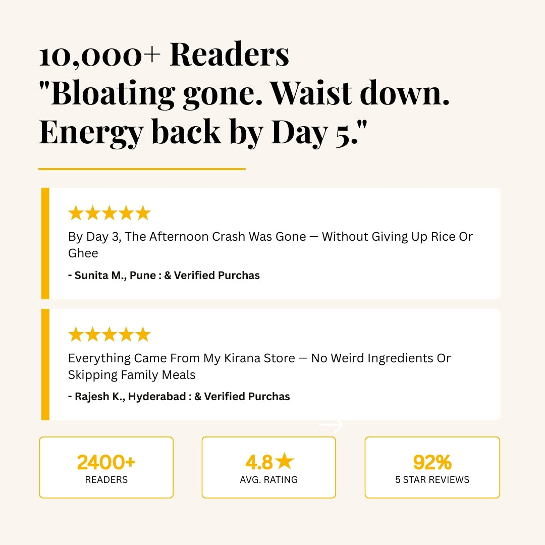 Designed for real Indian homes, this system works for busy people, shared kitchens, and zero-gym lifestyles. It helps reduce bloating fast, supports waist reduction, and restores energy — without skipping normal Indian meals.