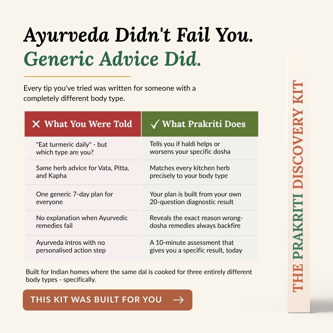 You've watched YouTube reels about Ashwagandha. Bought tulsi drops. Tried the "haldi every morning" advice — and nothing stuck. Not because Ayurveda doesn’t work, but because every piece of advice was built for a different body type. Generic wellness content gives the same advice to a Vata in Bengaluru and a Kapha in Lucknow — and that’s why it fails. The Prakriti Discovery Kit starts where everything else stopped — with your body.