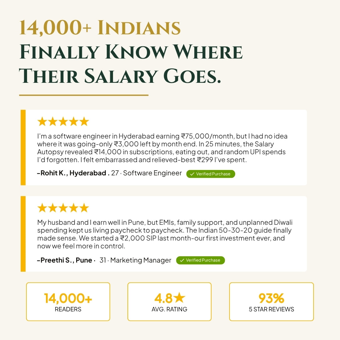 Tested with professionals across Tier 1 and Tier 2 cities, this kit reflects real patterns — UPI spending, festival expenses, and the pressure of balancing savings with family responsibilities. In 30 days, you get a clear picture of where every rupee goes — and a practical system to take control of it.